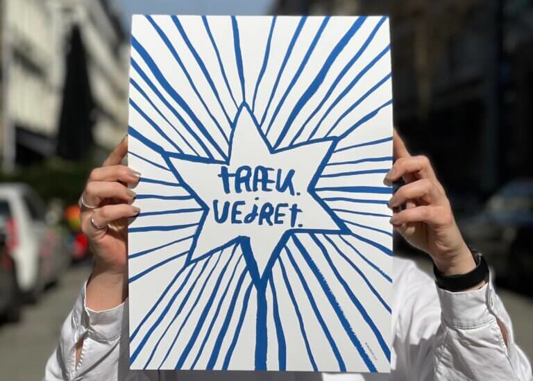 “Hvorfor er du så bitter her til morgen?” Spørger Line Jensens mand, Kjeldsen, i telefonen, netop som jeg træder ind i hendes lille butik i det indre København. Rummet er fyldt med bøger, tegninger i rammer, t-shirts og muleposer med satiriske tegninger fra hverdagslivet.