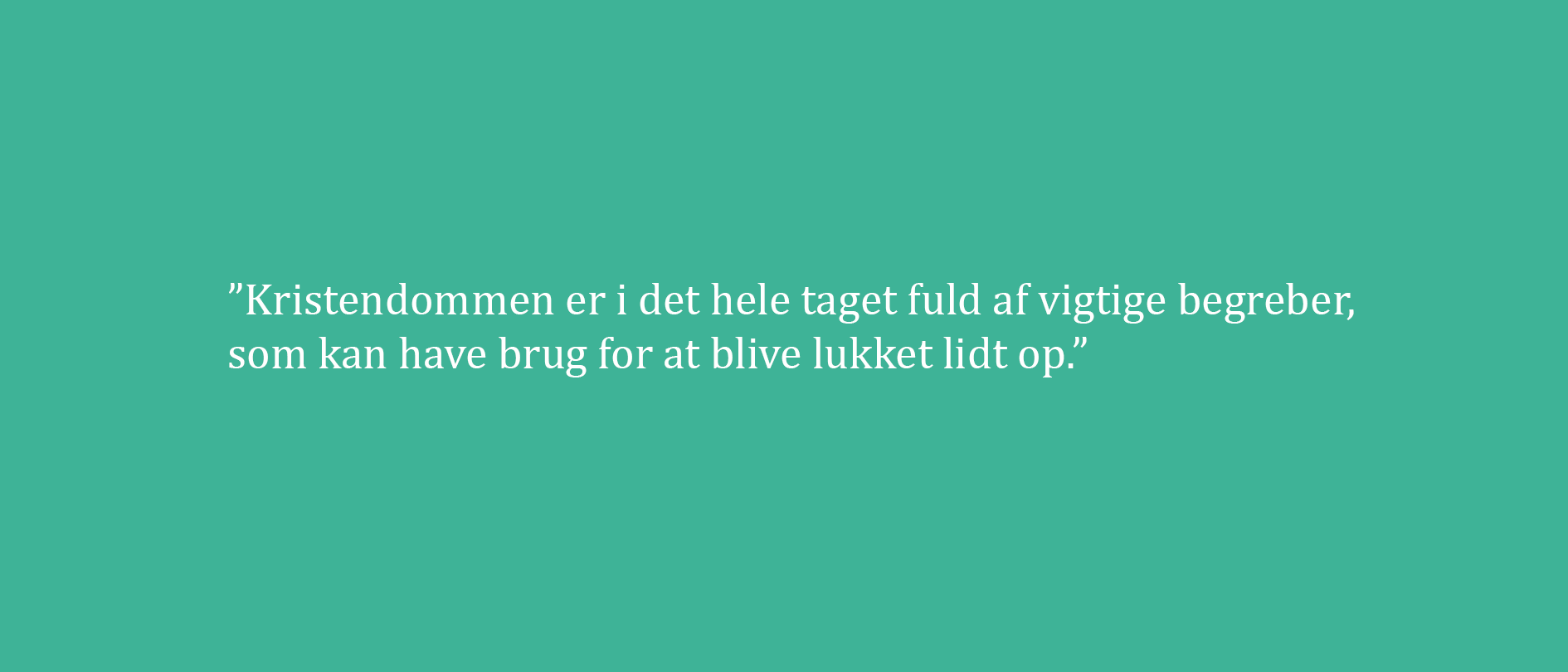 Hvad er det overhovedet at tro på Gud? Hvis vi ser den navnkundige, hvidskæggede mand for os, er vi allerede gået i gang med en avisartikellæsning af ordene i stedet for romanlæsningen. Gud er navnet for det, vi ikke kan forstå, og som vi heller aldrig kan komme til at forstå, sådan naturvidenskabeligt set. Hvorfor er der liv på jorden (og ikke hvordan er det opstået, for det forstår vi en del af og lærer hele tiden mere om)? Hvad er meningen med vores liv? Hvad er det for en livskraft, der får mig op af sengen hver dag, når jeg godt ved, at jeg alligevel bare skal dø ligesom alle dem, jeg elsker, også skal? ”Gud” er en måde at kunne tale om alle de spørgsmål på. Der findes også andre gode måder at tale om det uforståelige og uforklarlige på; det kristne sprog er ét bud. Og kristendommen er i det hele taget fuld af vigtige begreber, som kan have brug for at blive lukket lidt op.