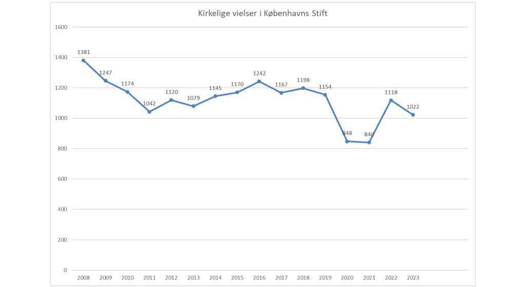 Sidste år blev 1077 par viet i en folkekirke i Københavns Stift. Bortset fra et coronadyk i 2020 og 2021, har antallet af vielser befundet sig mellem 1000 og 1200 de seneste 10 år.