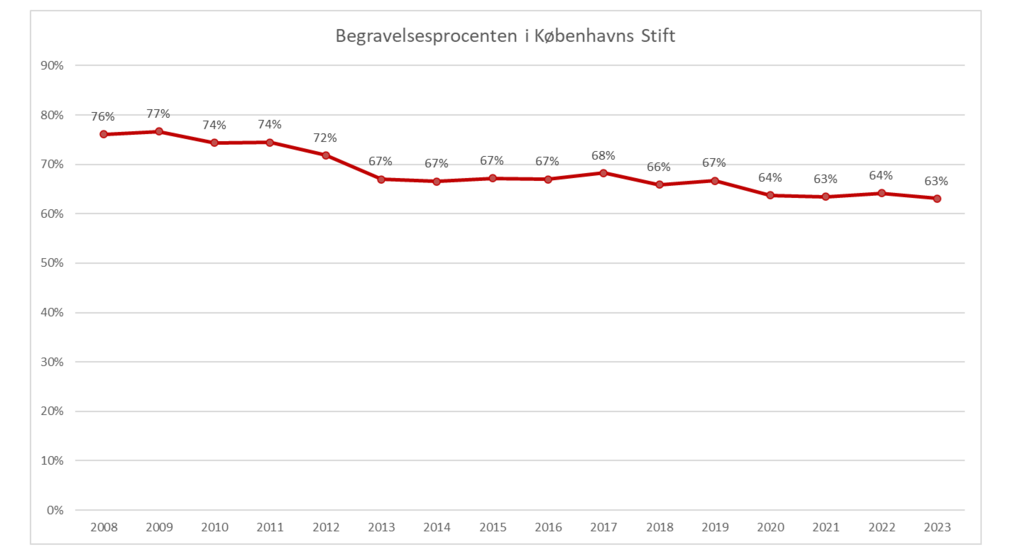 I 2023 blev 3604 mennesker begravet i en folkekirke i København eller på Bornholm. Det resulterer i en begravelsesprocent på 63%.