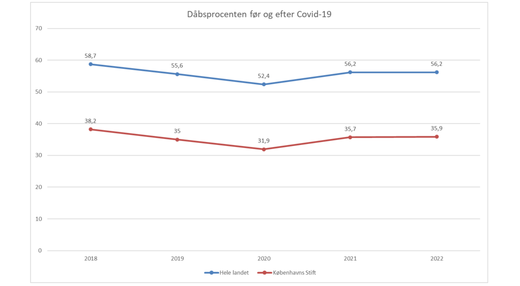 Der var et dyk i dåb (alle typer – ikke kun barnedåb) omkring pandemien i 2020, men den efterfølgende stigning i dåbstallet, da det igen blev muligt at blive døbt i en kirke, er fortsat ind i 2022.Således er dåbsprocenten i Københavns Stift faktisk steget fra 2021 til 2022 og ligger nu på 35,9%.