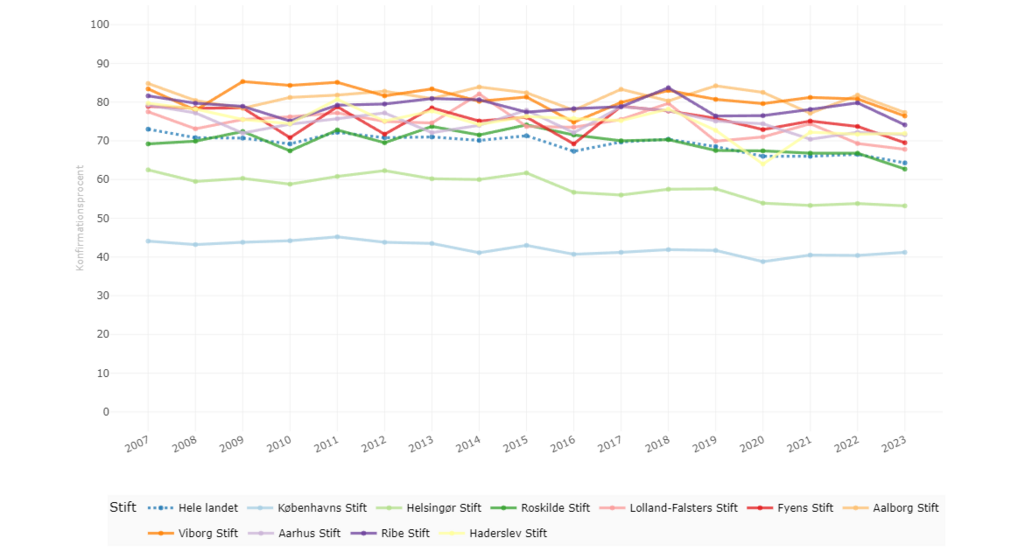 Du kan finde flere tal både for Københavns Stift og for alle landets stifter på FUV’s hjemmeside: https://www.fkuv.dk/folkekirken-i-tal.