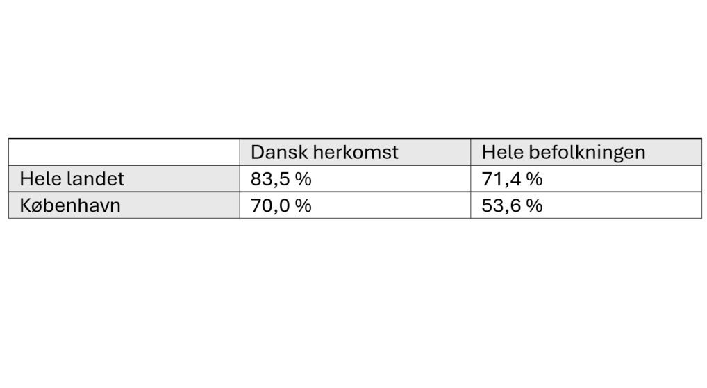 På landsplan er medlemsprocenten for personer af dansk herkomst på 83,5 %