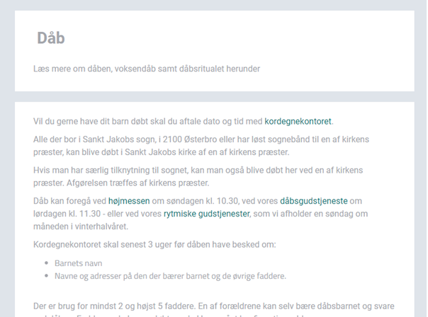 Selv om en potentiel dåbsfamilie i Vangede gerne vil læse jeres supergode valg af dåbssalmer, vælger de nok ikke at døbe deres barn i jeres kirke, hvis den ligger i Langeskov på Fyn. Det kan derfor være en god ide at skrive sin kirkes navn og by i sin sidebeskrivelse og titel, så ens besøgende på forhånd ved, hvem I er. Det er altid godt at få forhåndsafstemt med brugeren, inden de trykker sig ind på jeres side. Det gjorde vi eksempelvis i teksten omkring dåb i Sankt Jakobs Kirke på Østerbro.