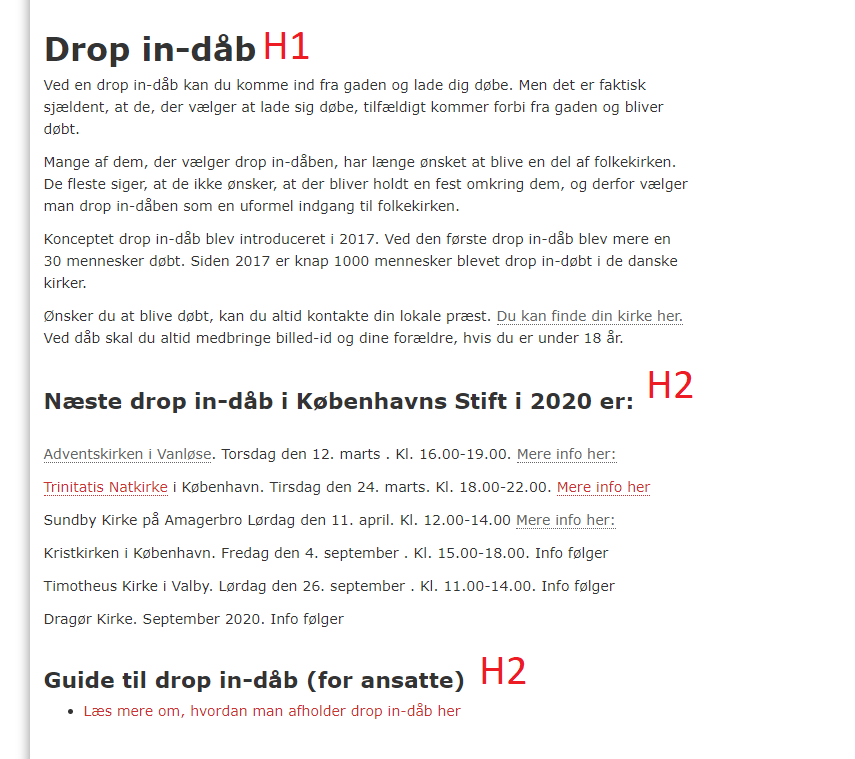 Drop in-dåb skal være i overskrift 1 (H1 og eneste H1 på siden)